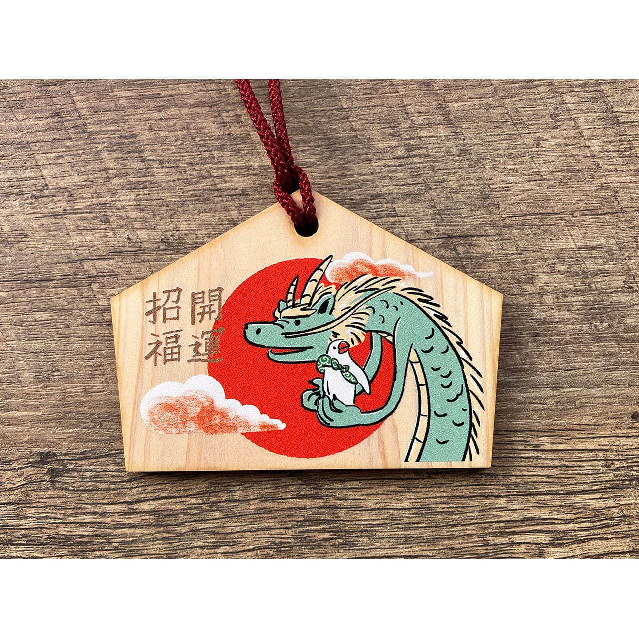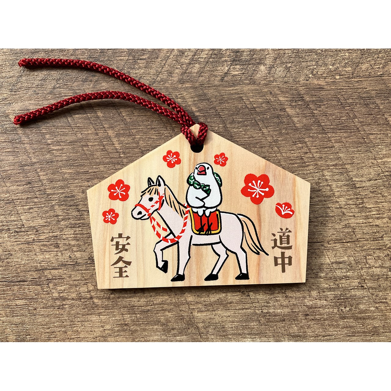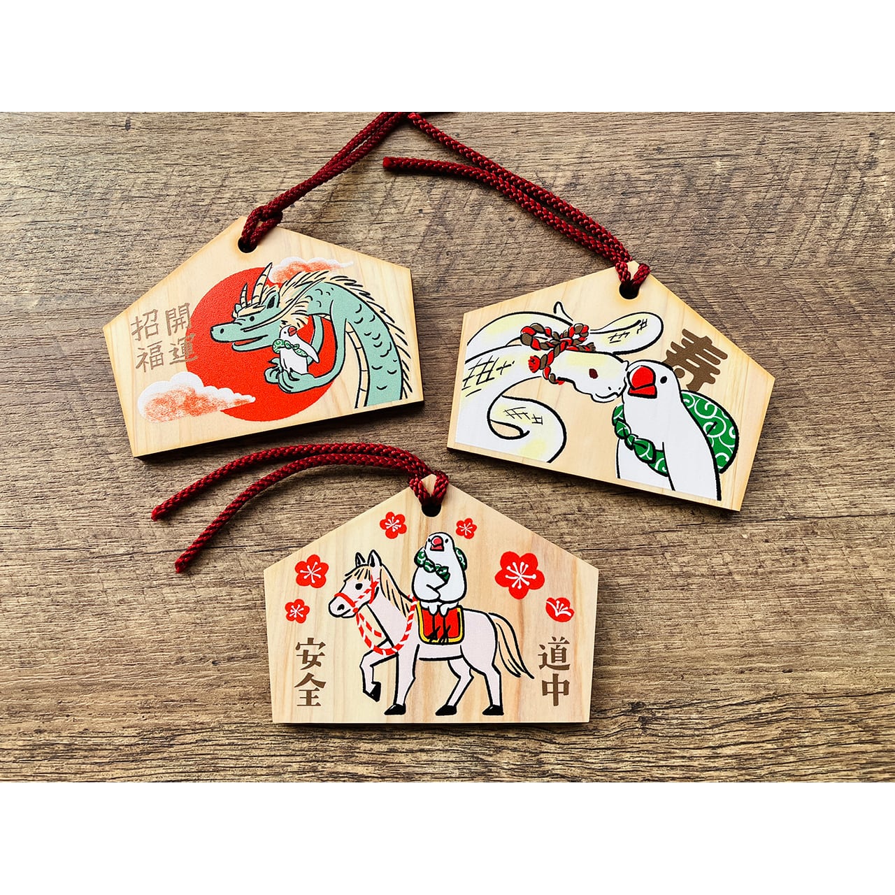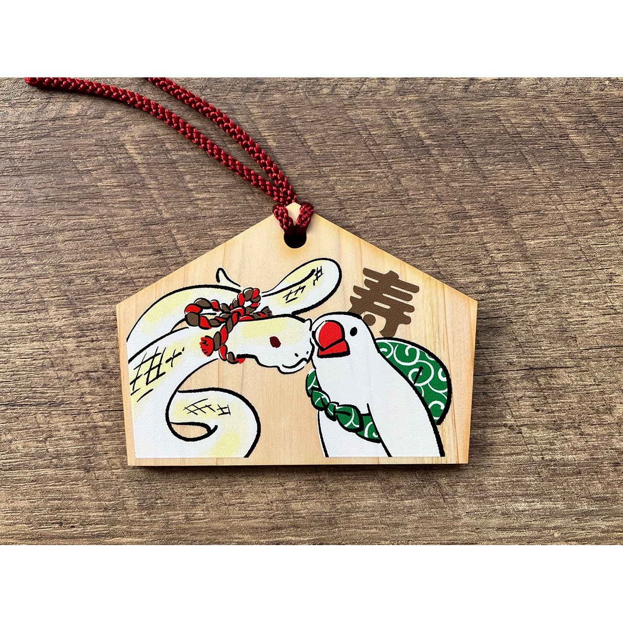 干支のイラストをプリントした絵馬です。ふろしき文鳥と干支の動物が寄り添うデザイン。ご自身の干支を選ぶのもおススメです!