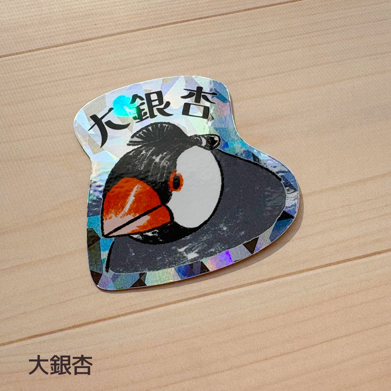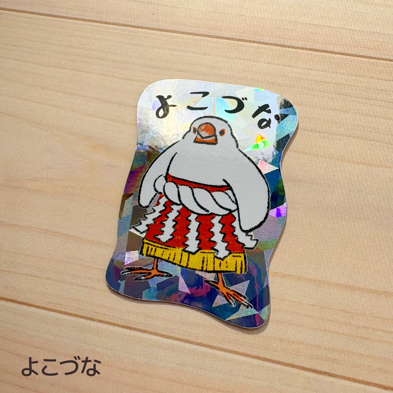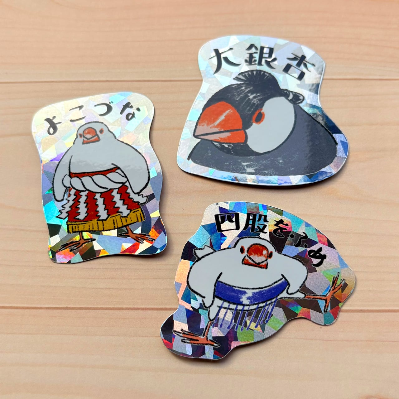 ホログラムステッカー「すもう文鳥」です!文鳥の相撲力士がキラキラと輝き、見る人を笑顔にするかわいいデザインです。スマホに挟めるサイズです。