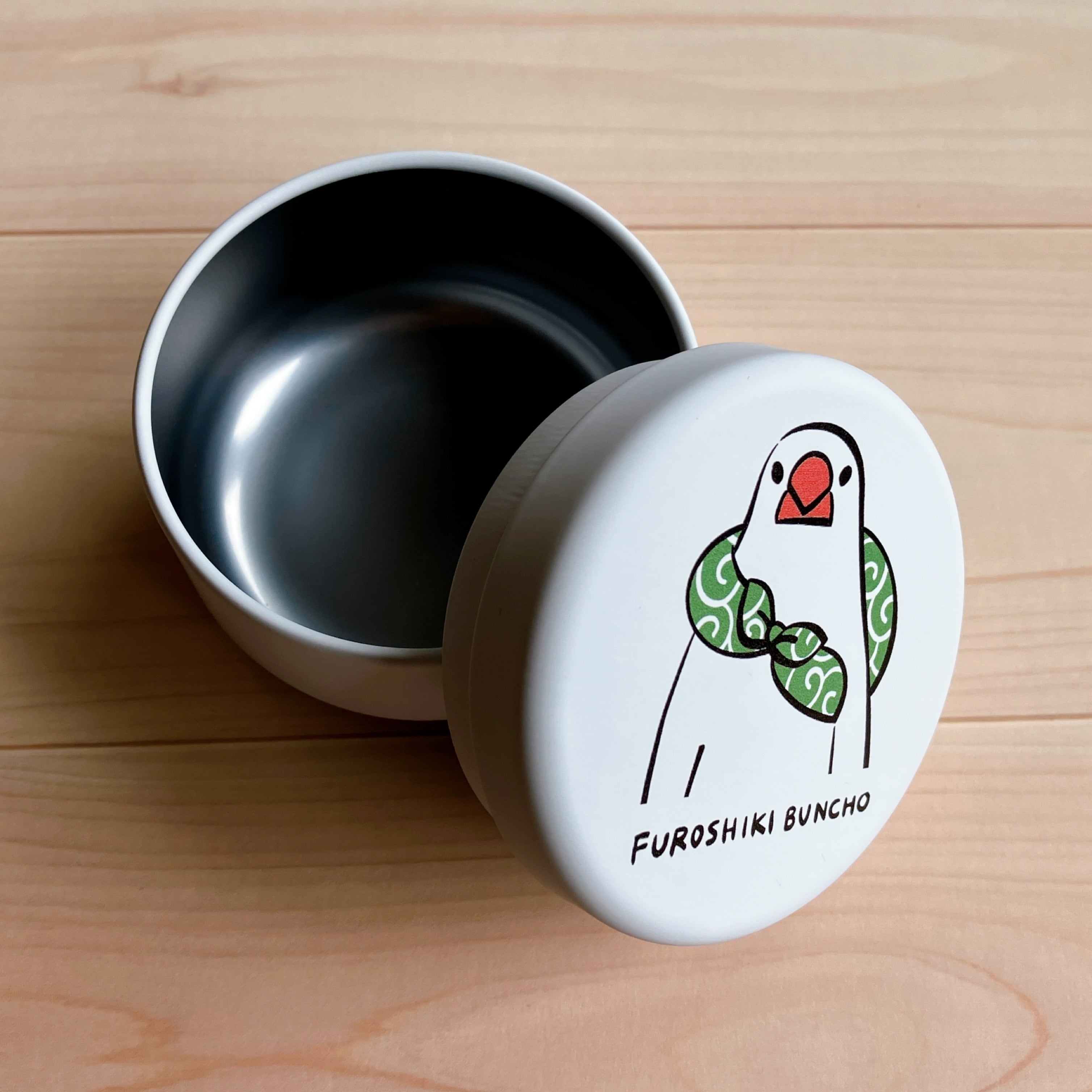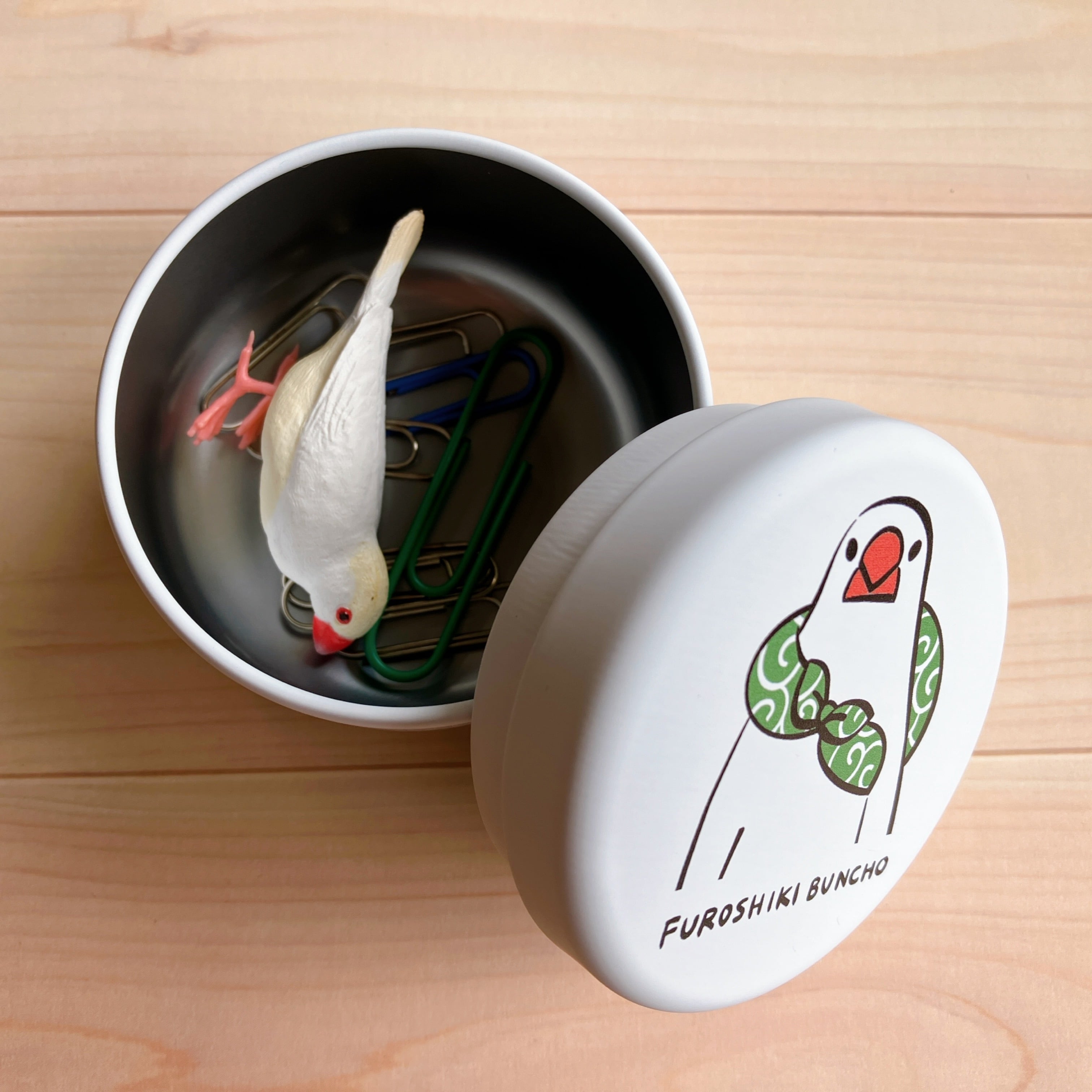 小さなものを収納するのにぴったりのふろしき文鳥ミニ缶小物入れ。マットな質感で優しい雰囲気の缶です。