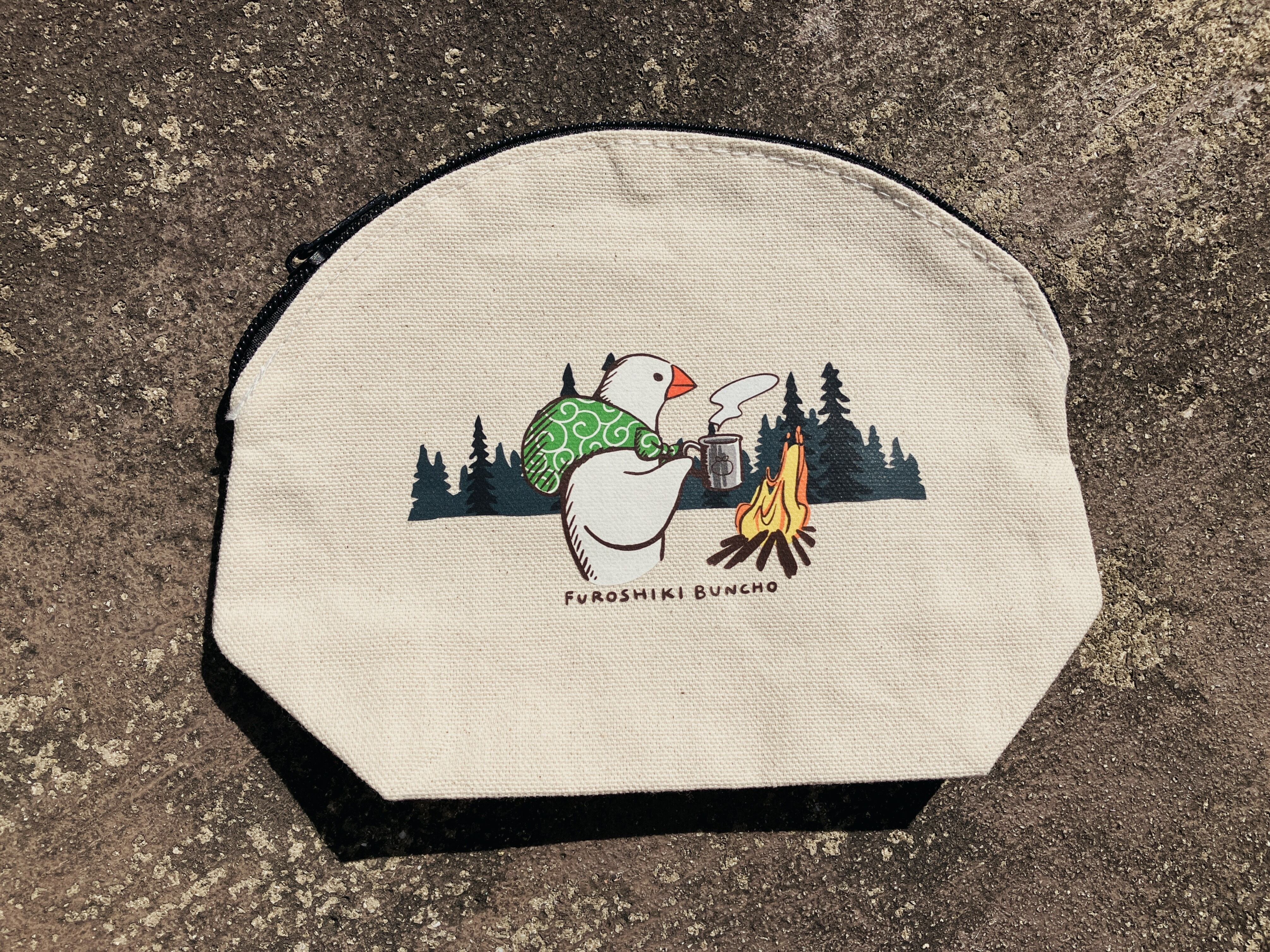 キャンプを彷彿とさせるデザインのふろしき文鳥シェル型ポーチ。ぬいぐるみを入れ、お出かけで持ち歩いても可愛らしい雰囲気を醸し出します。
